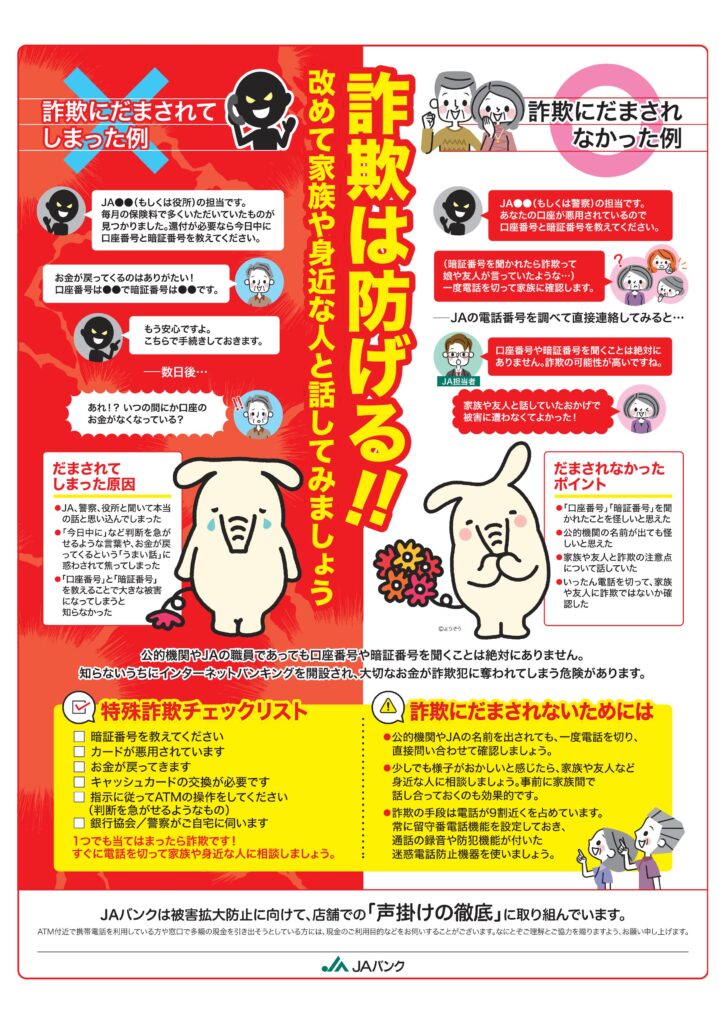 今般、当管内において自宅訪問のうえJA職員を名乗り、キャッシュカードをだまし取る被害が発生しております。JA職員がキャッシュカードや通帳、印鑑をお預かりすることはありませんので、詐欺等に十分ご注意願います。